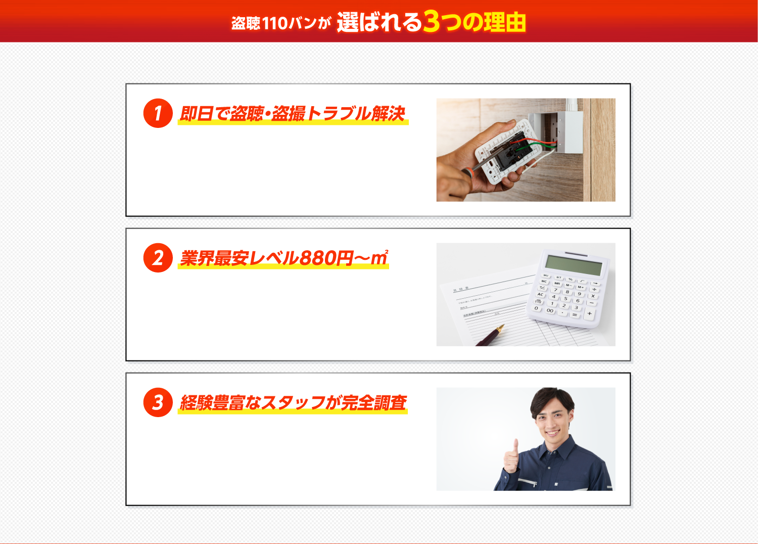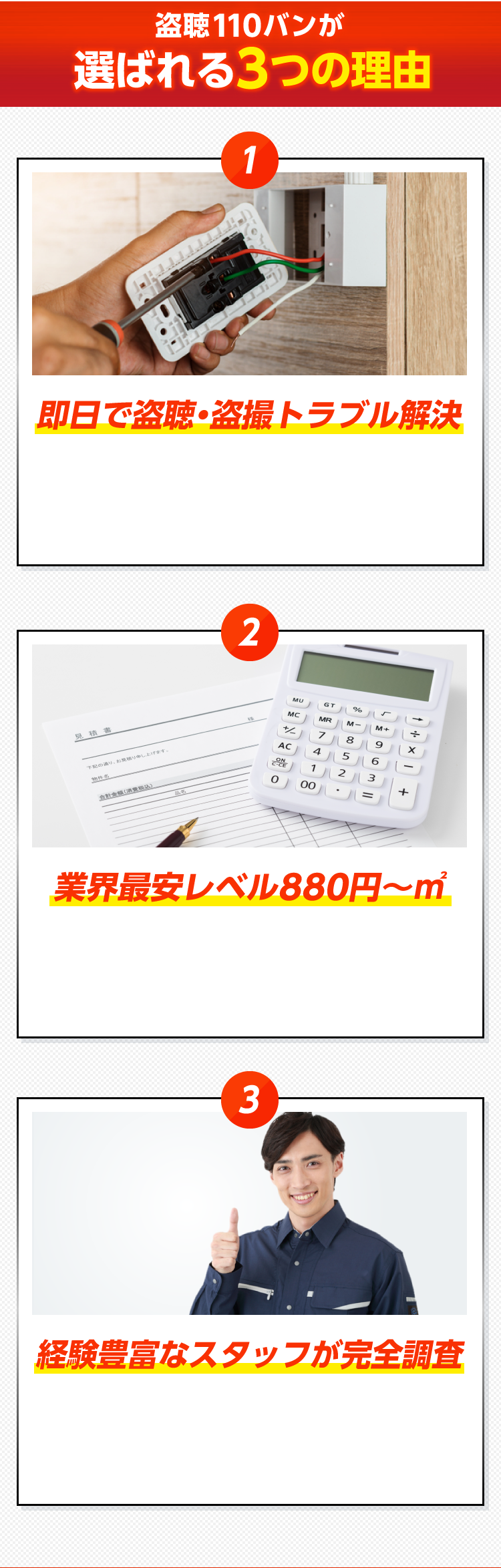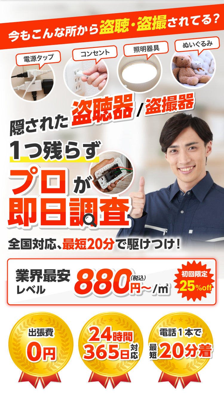 日本全国の盗聴器・盗撮器トラブルに迅速対応。24時間365日今すぐ駆けつけ。お電話から最短20分で到着いたします。