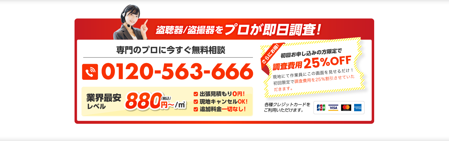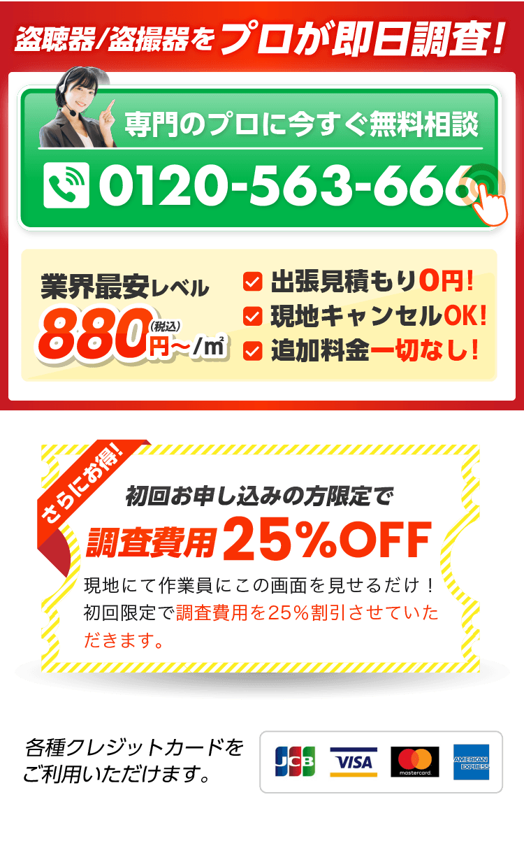 盗聴110バンは業界最安レベルの料金で盗聴器・盗撮器調査を実施いたします。さらに初回限定で調査費用が25%OFFに!